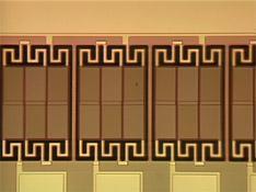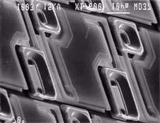 | It consists of a two-layer structure. An interconnecting readout circuitry is applied to the silicon process wafer and then the microbolometer structure is built on top of the readout circuitry. First a pattern of islands _ wavelength thick are deposited on the readout circuitry. The islands are made of a material that can be selectively etched away later to form a bridge structure. Three layers -- silicon nitride, vanadium oxide, and silicon nitride -- are deposited over the sacrificial islands. The sacrificial islands are then etched away leaving the thermally isolated bridge structure of vanadium oxide. A photo of an early Honeywell microbolometer element is shown in the picture below followed by a photo of one corner of a 320 by 240 microbolometer array |